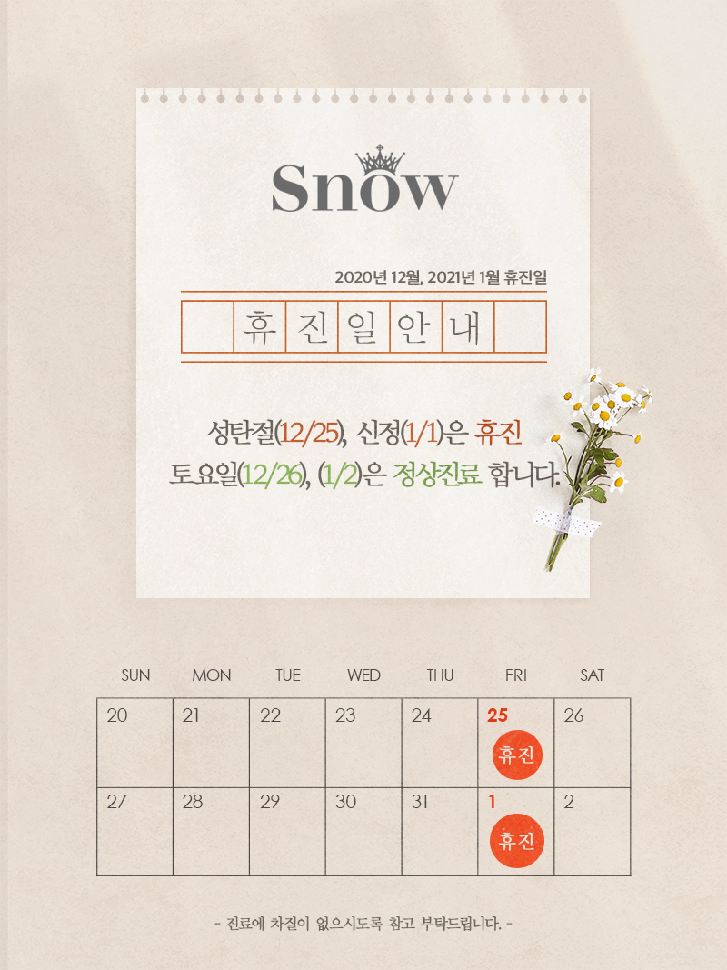 성탄절 12/25일, 신정1/1일은 휴진합니다.